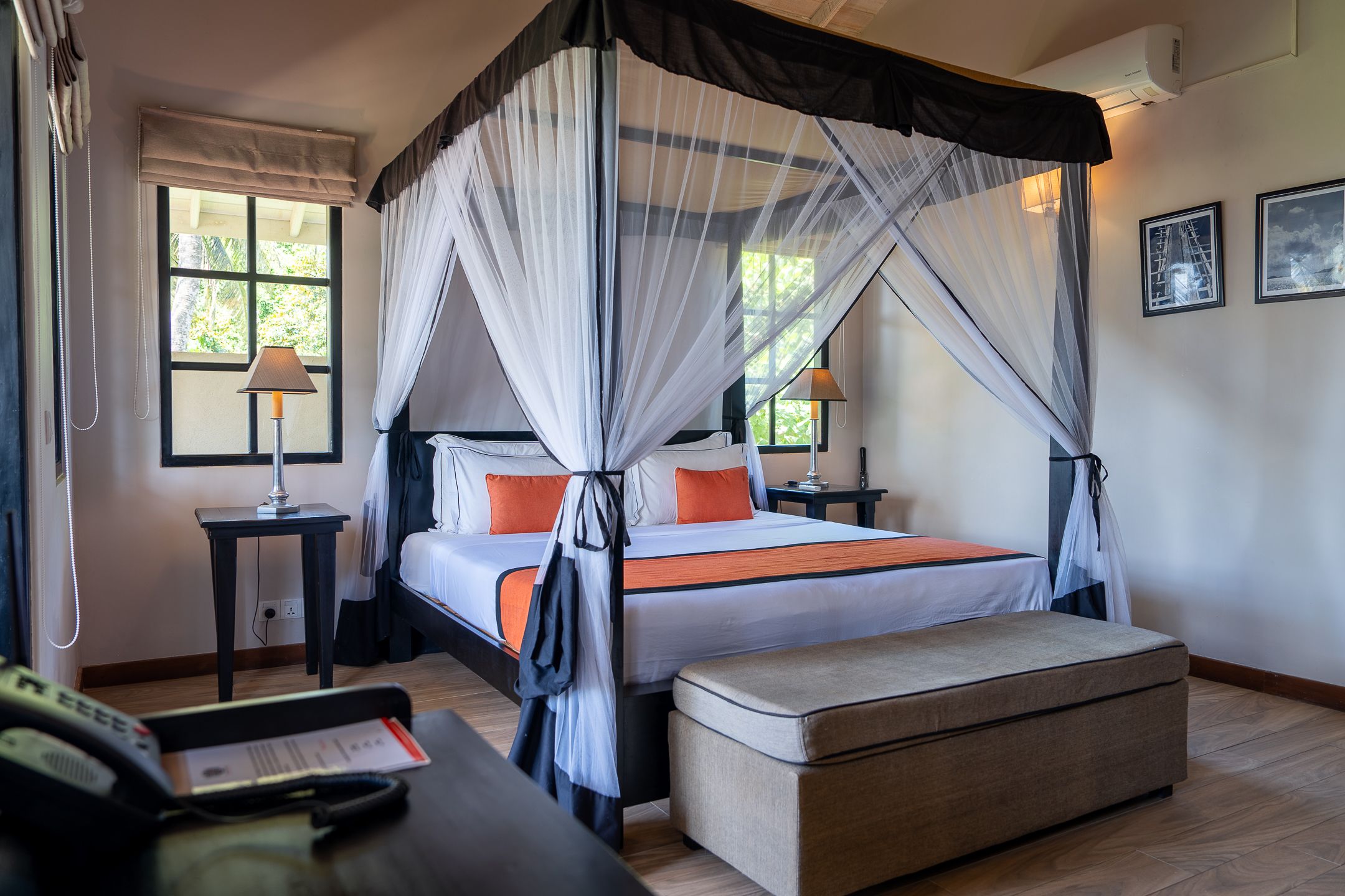 Inside, the design centers around a king-size four-poster bed with a mosquito net, soft linens, and a calm, uncluttered layout. The atmosphere is warm and grounded, with natural materials and handcrafted elements reflecting the resort’s broader design language.